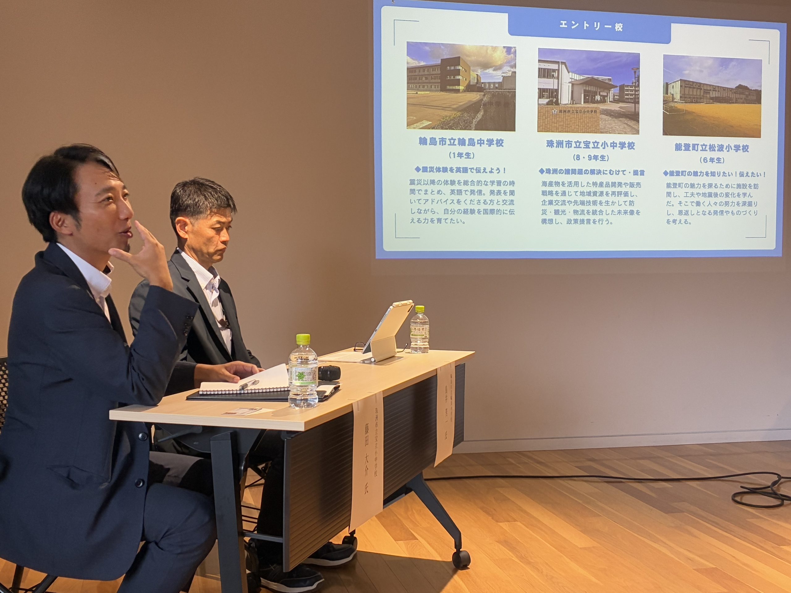 輪島市立輪島中学校の鳥井芳一教諭からは震災体験を英語で発信する試み、珠洲市立宝立小中学校の藤田大介教諭からは地域資源の価値を見直す特産品開発や、防災・観光・物流を統合した未来像を示す「宝立町スマートマップの作成」など、子どもたちが課題を設定し、自ら取り組みたいと熱意を持って動いている具体的な活動が報告されました。
