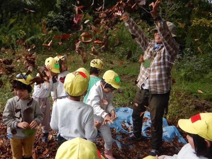まずは、インストラクターさんと焼き芋に関連した手遊びをしたり絵本を見たりして、園から持ってきた落ち葉で遊んだりしました。
