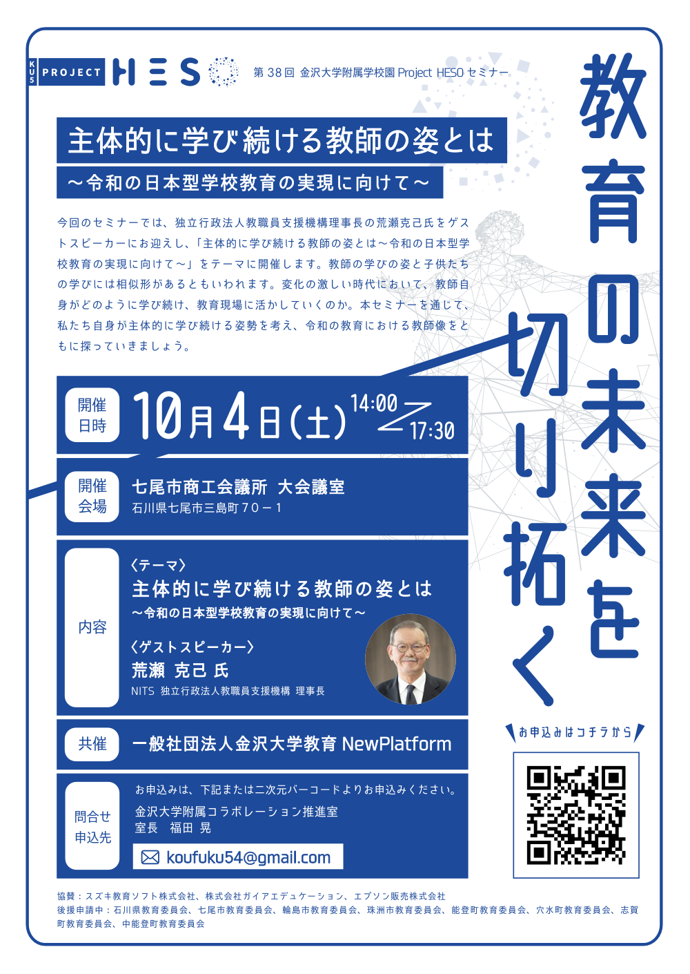 今回のセミナーでは、独立行政法人教職員支援機構理事長の荒瀬克己氏をゲストスピーカーにお迎えし、「主体的に学び続ける教師の姿とは〜令和の日本型学校教育の実現に向けて〜(仮)」をテーマに開催します。