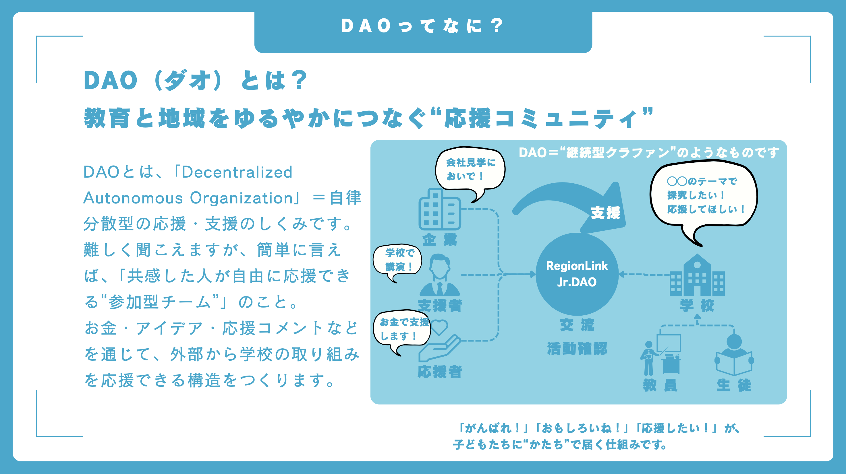 今回の『へそDAOプロジェクト』は、私たちにとっても未来への投資だと捉えています。成功すれば全国の小中学校に勇気を与え、さらなる取り組みの後押しにつながると思います。